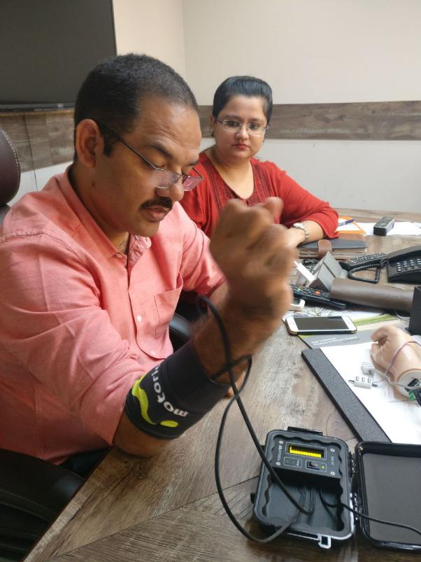 Итак, это специальный прибор, который снимает сигналы с мышц и определяет их силу. Он фиксирует в пределах ли необходимой нормы активность мышц и помогает понять, возможна ли установка бионического протеза. Но его главная особенность в том, что он портативный. Сейчас далеко не везде доступна электромиография, которая определяет потенциал мышц, и зачастую людям приходится ехать для этого в районные центры или ближайшие крупные города. Это не всегда удобно или возможно, прибор небольшого размера и веса решит проблему доступности электромиографии хоть где: и в российских регионах, и в Индии.